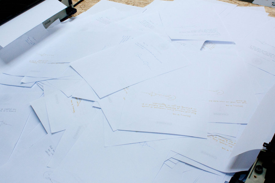 In the installation I've juxtaposed two pen plotters. One writes quotes as the 'candidate' Obama in gold, the other responds as the 'president' Obama in blue fountain pen. They alternately write a letter after it is signed, it's flung away by the machine. Over time these letter form a pile in-between the plotters in which Obama continually contradicts himself on i.e. PRISM, transparency and Guantanamo Bay.